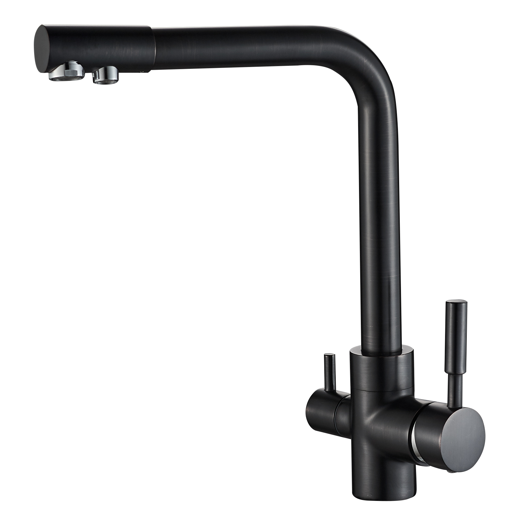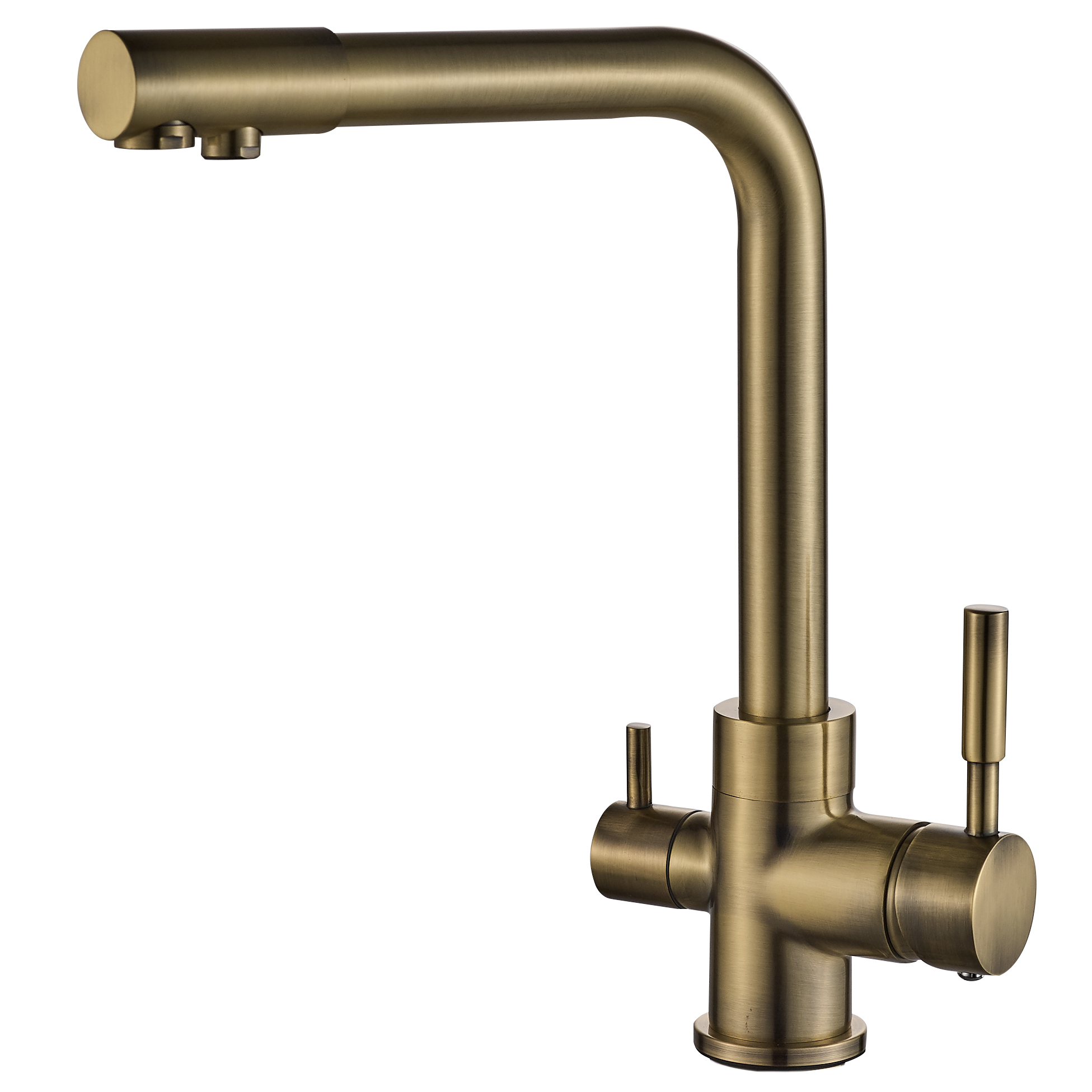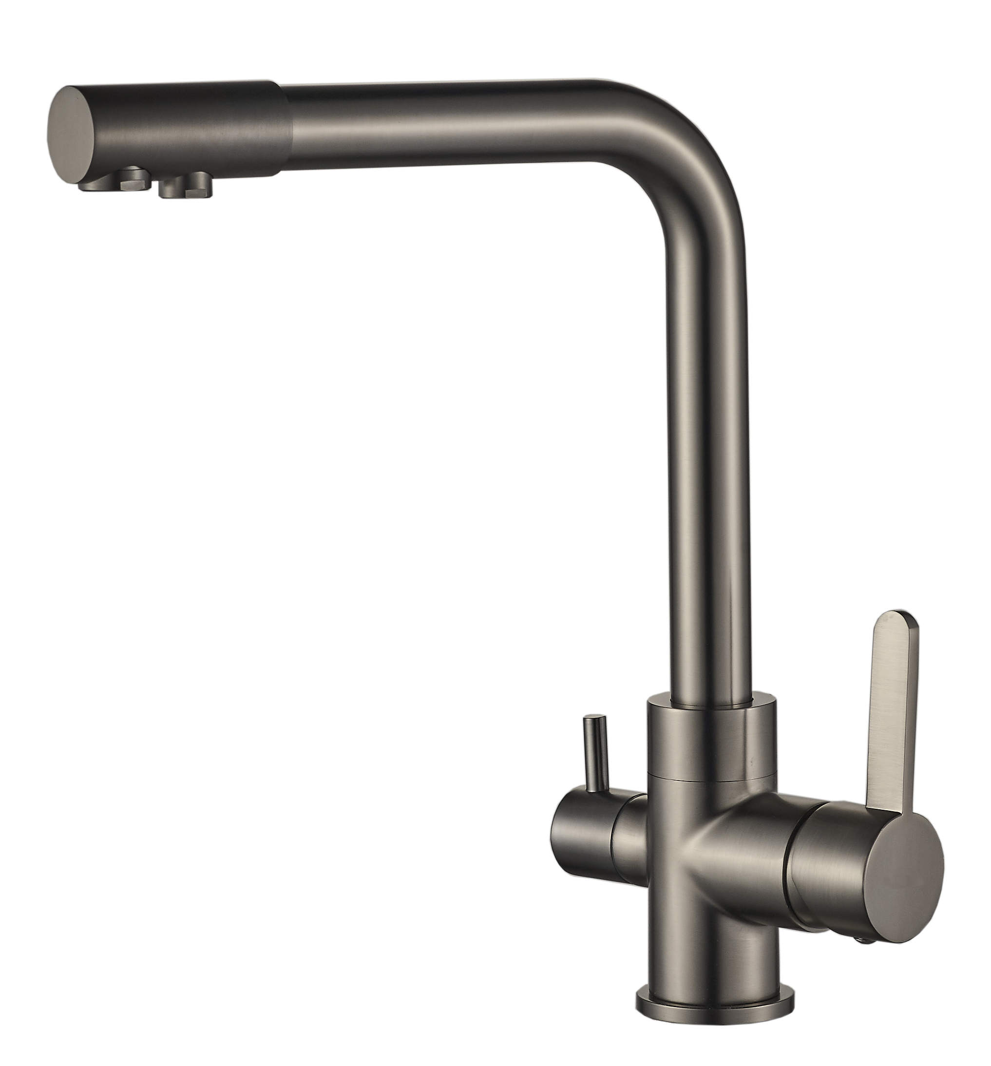 Kuhinjska slavina 3 u 1 (model A-103) praktično je rješenje koje eliminira potrebu za ugradnjom dodatne male slavine za filtriranu vodu. Ovaj model ima odvojene putove za standardnu vodovodnu vodu (toplu i hladnu) te pročišćenu vodu iz sustava reverzne osmoze ili drugog filtera. Zahvaljujući modernom dizajnu s čistim linijama, savršeno se uklapa u suvremene kuhinje, štedeći prostor na sudoperu.