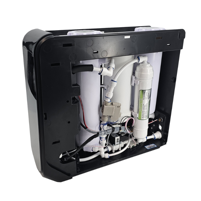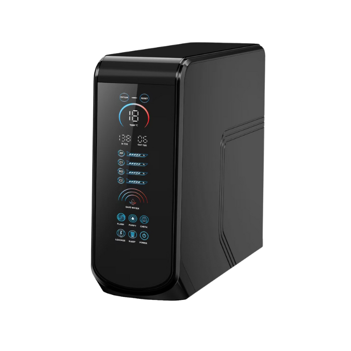 Inteligentni RO uređaj za filtriranje vode s ugrađenim spremnikom, koji prikazuje kvalitetu vode (TDS ulazne i izlazne), status filtera, temperaturu i stanje sustava. Namijenjen kućanstvima, obično se ugrađuje ispod sudopera i osigurava višestupanjski sustav pročišćavanja za sigurnu i čistu pitku vodu.